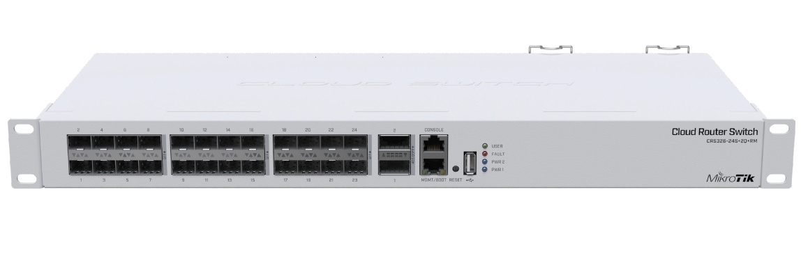 Cloud Router Switch CRS326-24S+2Q+RM je operačním systémem SwOS či RouterOS ("Dual boot") poháněný 26-portový Gigabitový Ethernet switch v rack provedení.