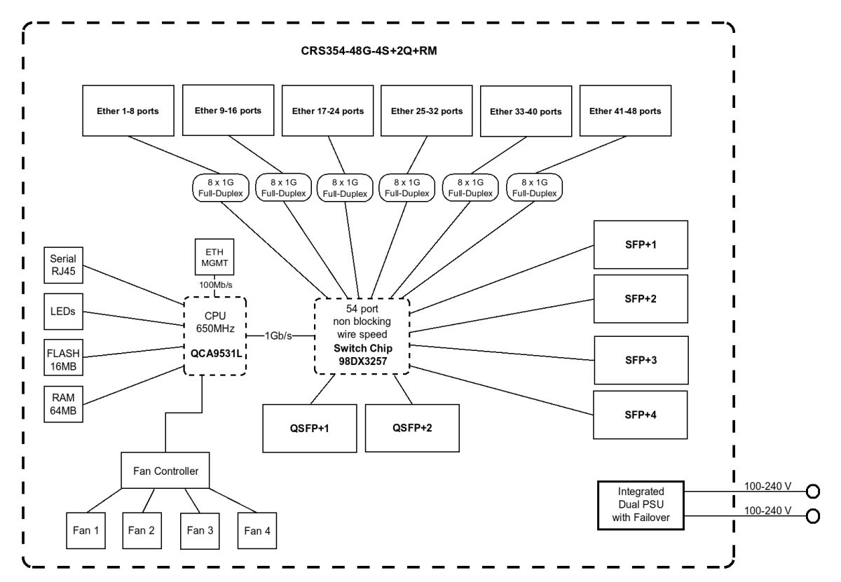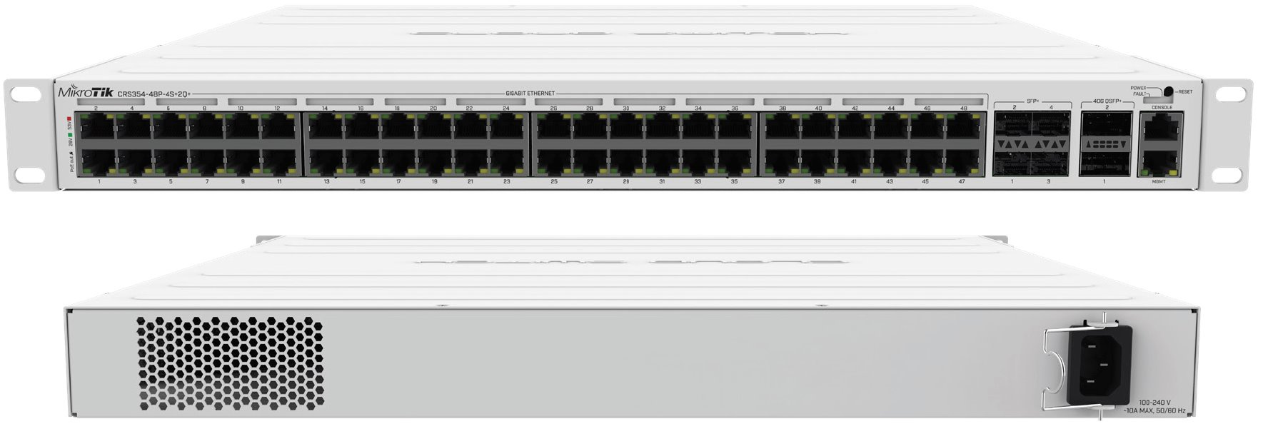 Technické specifikace: Product code: CRS354-48P-4S+2Q+RM CPU: QCA9531, 650 MHz Size of RAM: 64 MB Storage: 16 MB flash Number of 100 Mbps Ethernet ports: 1 Number of 1 GbE Ethernet ports: 48 10G SFP+ ports: 4 40G QSFP+ ports: 2 Operating system: RouterOS (License level 5) Supported input voltage: AC power supply 100 - 240 V Serial port: RJ45 Dimensions: 443 x 382 x 44 mm Operating temperature: -20°C to +60°C