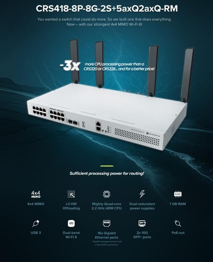 Jedná se o významný upgrade pro všechny, kteří chtějí nahradit změť zařízení jedním chytrým multitaskerem – navrženým pro skutečné směrovací úlohy, uplinky s vysokou šířkou pásma a přehlednou správu kabelů. Ať už napájíte přístupové body a CCTV kamery, provozujete rychlý NAS s řadou moderních pracovních stanic nebo spravujete směrování ve středně velké kanceláři, CRS418 to vše zvládne s lehkostí a za rozumnou cenu.
