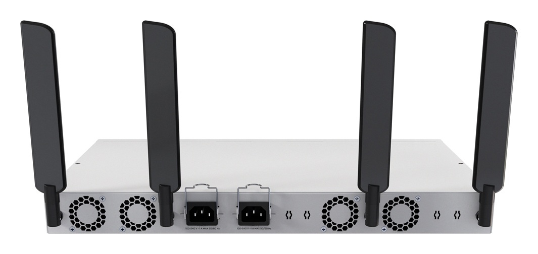 Tento all-in-one switch/router nabízí také dvoupásmovou Wi-Fi 6 s technologií 4×4 MIMO – pro rychlé a spolehlivé připojení, ať už ho potřebujete kdekoli. Perfektní řešení pro zjednodušení nastavení serveroven v suterénu nebo středně velkých kanceláří s omezeným rozpočtem – nyní s sebou nemusíte nosit samostatný access point. Z důvodu slabšího bezdrátového pokrytí v rackových montážích je CRS418 Wi-Fi edition vybaven speciálními otvory na zadní straně pro pigtaily, takže v případě potřeby můžete antény umístit mimo skříň.