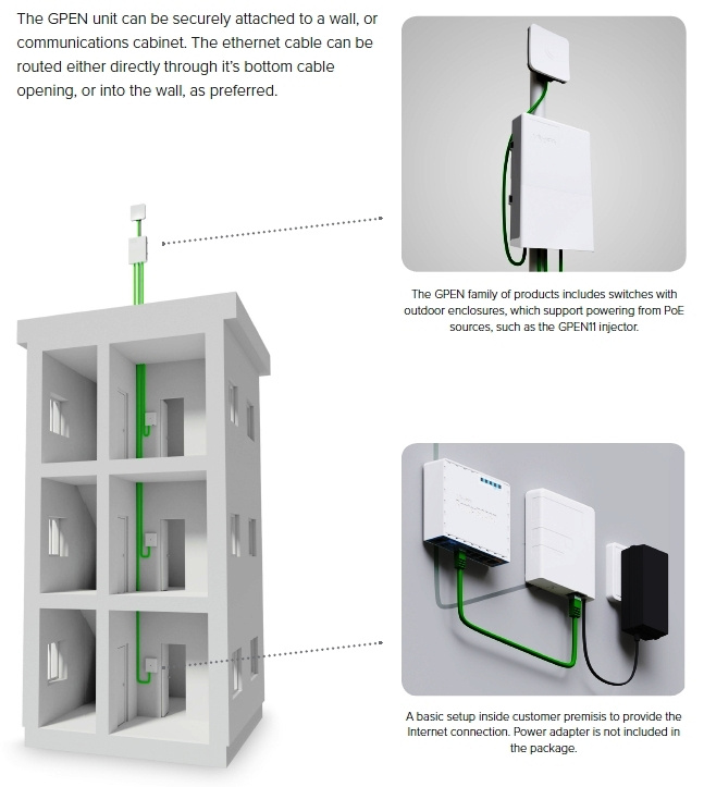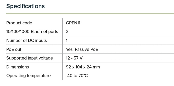 GPEN11 je nástěnný napájecí injektor umožňující PoE napájení aktivních prvků. Jedná se o součást GPEN (Gigabit Passive Ethernet Network) konceptu firmy Mikrotik jako ekonomičtější alternativy k GPON instalacím. GPEN11 je určen k montáži přímo v místě zákaznické instalace u domácího WiFi routeru zprostředkovávajícím konektivitu. GPEN11 tak prostřednictvím PoE zprostředkovává napájení ISP routeru/switche venkovně instalovaného na objektu. Montáž umožňuje instalaci na zeď či do rozvaděče (součástí dodávky K-62 kit) . Technické specifikace: Product code: GPEN11 10/100/1000 Ethernet ports: 2 Number of DC inputs: 1 PoE out: Yes (Passive PoE) Supported input voltage: 12 - 57 V Dimensions: 92 x 104 x 24 mm Operating temperature: -40 to 70°C