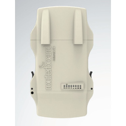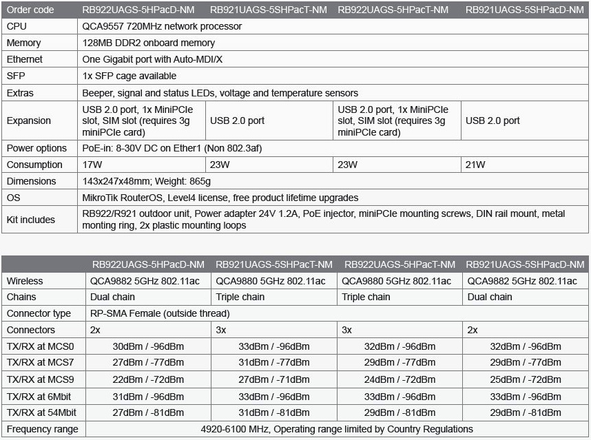 CPU: QCA9557 720MHz network processor Memory: 128MB DDR2 onboard memory Ethernet One Gigabit port with Auto-MDI/X SFP: 1x SFP cage available Extras: Beeper, signal and status LEDs, voltage and temperature sensors Expansion: USB 2.0 port, 1x MiniPCIeslot, SIM slot (requires 3gminiPCIe card) Power options PoE-in: 8-30V DC on Ether1 (Non 802.3af) Consumption: 17W Dimensions: 143x247x48mm; Weight: 865g OS: MikroTik RouterOS, Level4 license, free product lifetime upgrades Wireless: QCA9882 5GHz 802.11ac Chains: Dual chain Connector: 2x RP-SMA Female (outside thread) Kit includes: - RB922/R921 outdoor unit - Power adapter 24V 1.2A - PoE injector - miniPCIe mounting screws - DIN rail mount - metal monting ring - 2x plastic mounting loops