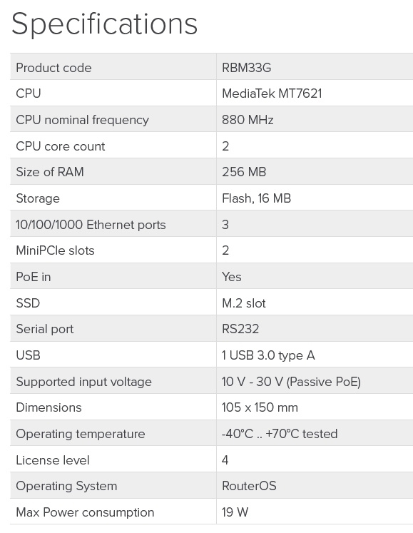 Technické specifikace: Product code: RBM33G CPU: MediaTek MT7621 CPU nominal frequency: 880 MHz CPU core count: 2 Size of RAM: 256 MB Storage Flash: 16 MB 10/100/1000 Ethernet ports: 3 MiniPCIe slots: 2 PoE in: Yes SSD: M.2 slot Serial port: RS232 USB: 1 USB 3.0 type A Supported input voltage: 10 V - 30 V (Passive PoE) Dimensions: 105 x 150 mm Operating temperature: -40°C .. +70°C tested License level: 4 Operating System: RouterOS Max Power consumption: 19 W