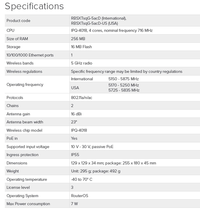Technické specifikace: Product code: RBSXTsqG-5acD CPU: IPQ-4018, 4 cores, nominal frequency 716 MHz Size of RAM: 256 MB Storage :16 MB Flash 10/100/1000 Ethernet ports: 1 Wireless bands: 5 GHz radio Operating frequency: 5150 - 5875 MHz Protocols: 802.11a/n/ac Chains: 2 Antenna gain: 16 dBi Antenna beam width: 23° Wireless chip model: IPQ-4018 PoE in: Yes Supported input voltage: 10 V - 30 V, passive PoE Ingress protection: IP55 Dimensions: 129 x 129 x 34 mm; package: 255 x 180 x 45 mm Weight Unit: 295 g; package: 492 g Operating temperature: -40 to 70° C License level: 3 Operating System: RouterOS Max Power consumption: 7 W