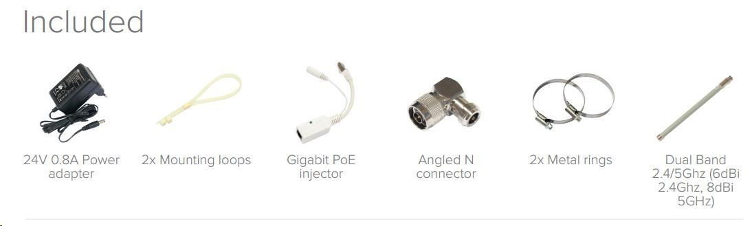 Balenie obsahuje: RouterBOARD GrooveA-52HPn, injektor PoE, napájací zdroj, montážnu sadu (o-krúžky), pravouhlý N-rozbočovač a všesmerovú anténu 6 dBi.