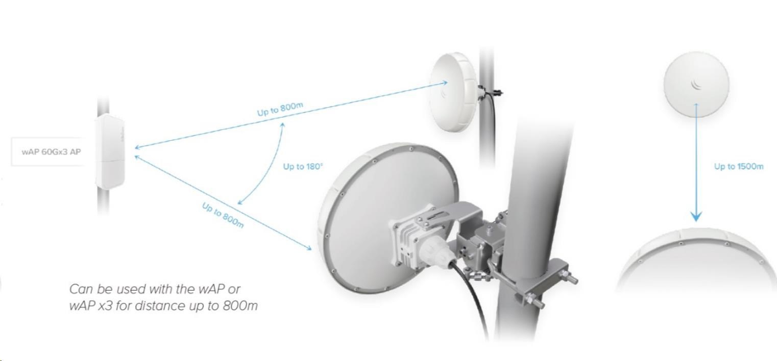 nRAYG-60adpair je ďalšou revolučnou novinkou v sortimente MikroTik, ktorá osloví každého, kto stavia stredne dlhé spoje. Ide o riešenie ptp v pásme 60 GHz, ktoré spolupracuje so štandardom 802.11ad, ktorý v reálnej prevádzke umožňuje priepustnosť až 1000 Mb/s Full Duplex na vzdialenosť až 1500 m. Spoločnosť MikroTik tvrdí, že táto jednotka má rovnaký zisk ako jednotky LHG (RBLHGG-60ad), ale s menšou veľkosťou a radom ako bonusom, ktorý privítajú všetci poskytovatelia internetových služieb v nepriaznivom počasí. RouterBoard je ako vždy vybavený veľmi obľúbeným operačným systémom RouterOS s licenciou L3. Ak chcete jednotku aktualizovať na prístupový bod, stačí si zakúpiť licenciu L4.