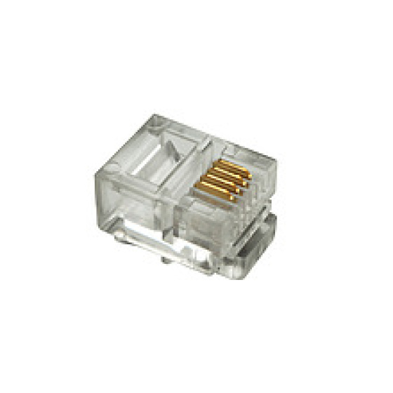 Nestíněný konektor RJ 11 pro připojení telekomunikačních zařízení, 6p4c. Pro vodič licna a plochý kabel. Konektory Solarix typu RJ11 jsou spolehlivé komponenty, které jsou konstrukčně uzpůsobeny tak, aby bylo zajištěno bezchybné spojení mezi kontakty konektoru a měděnými vodiči datového kabelu. V případě konektorů RJ12 a RJ11 je krytí zlatem 15 µ a tyto konektory jsou určeny především pro oblast telekomunikací. Konektory jsou baleny po 100 ks.