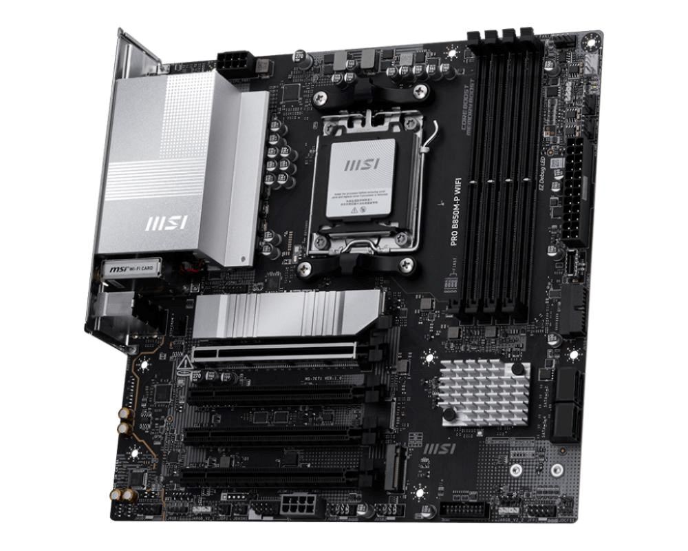 PRO B850M-P WIFI offers a simple design with a harmonious silver color scheme that perfectly matches both white and black PC builds. It is engineered with many exclusive features of MSI, a Wi-Fi 7 with EZ Antenna, 5G LAN, PCIe 5.0 M.2 with EZ M.2 Shield Frozr II, and Supplemental PCIe Power, ready for the AMD Ryzen™ 9000 series processors.