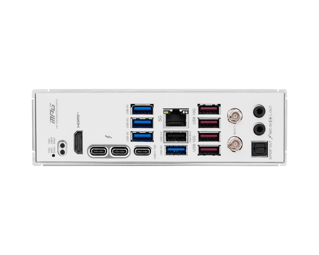Porty na zadním panelu: * 1x RJ-45 5G LAN * 1x Wi-Fi/Bluetooth modul * 2x audio konektor * 1x optický S/PDIF Out * 1x tlačítko Flash BIOS * 1x tlačítko Clear CMOS * 2x Thunderbolt™ 4 40Gb/s (typ C) * 1x HDMI™ * 1x USB 3.2 Gen 2 10Gb/s (typ C) * 4x USB 3.2 Gen 2 10Gb/s (typ A) * 4x USB 3.2 Gen 1 5Gb/s (typ A) * 1x USB 2.0