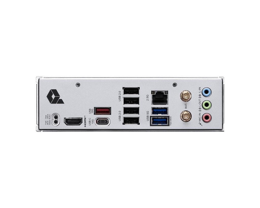 Porty na zadním panelu: * 1x USB 3.2 Gen 2 10Gb/s (typ C) * 1x USB 3.2 Gen 2 10Gb/s (typ A) * 2x USB 3.2 Gen 1 5Gb/s (typ A) * 4x USB 2.0 * 1x HDMI™ * 1x RJ-45 2,5G LAN * 1x Wi-Fi/Bluetooth * 3x audio konektor * tlačítko Flash BIOS * tlačítko Clear CMOS