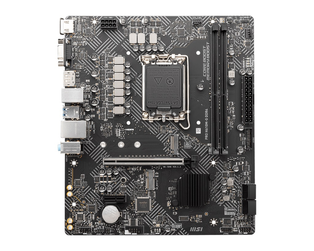 Chipset: Intel® H610 Rozměrový formát: Micro-ATX (244x211mm) Podpora pro procesory: 13. a 12. generace Intel® Core™, Pentium® Gold a Celeron® Patice procesoru: LGA1700 Paměť: * 2x paměťový slot DDR4, podpora až 64GB, 2133/2666/3200 (JEDEC & POR) * dvoukanálová architektura paměti Grafické výstupy: * 1x HDMI™ * 1x VGA Zvuková karta: kodek Realtek® ALC892/ALC897 7.1kanálový zvuk s vysokým rozlišením Ethernet: Intel® I219V 1G LAN WLAN + Bluetooth: ne Rozšiřující sloty: * 1x PCIe x16 (podporuje až PCIe 4.0 x16) * 1x PCIe x1 (podporuje PCIe 3.0 x1) * 1x M.2 s E-key pouze pro PCIe WiFi modul (M2_ WIFI1) Úložný prostor: celkem podporuje 1 slot M.2 a 4 porty SATA 6Gb/s * 1x M.2, M key, typ 2280/2260/2242 - podpora PCIe 3.0 x4 * 4x port SATA 6Gb/s