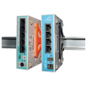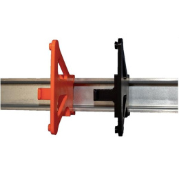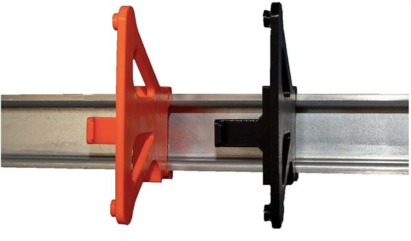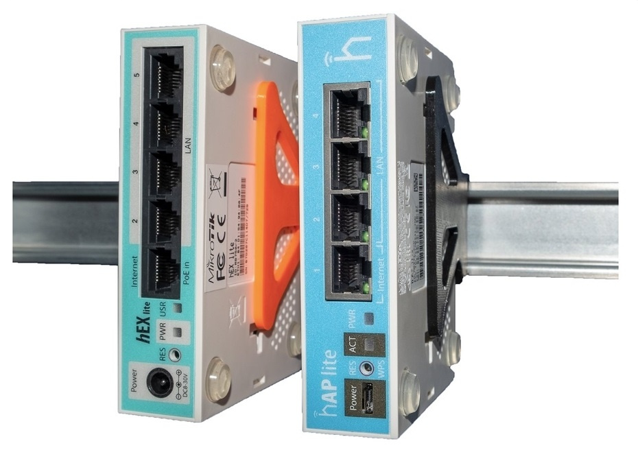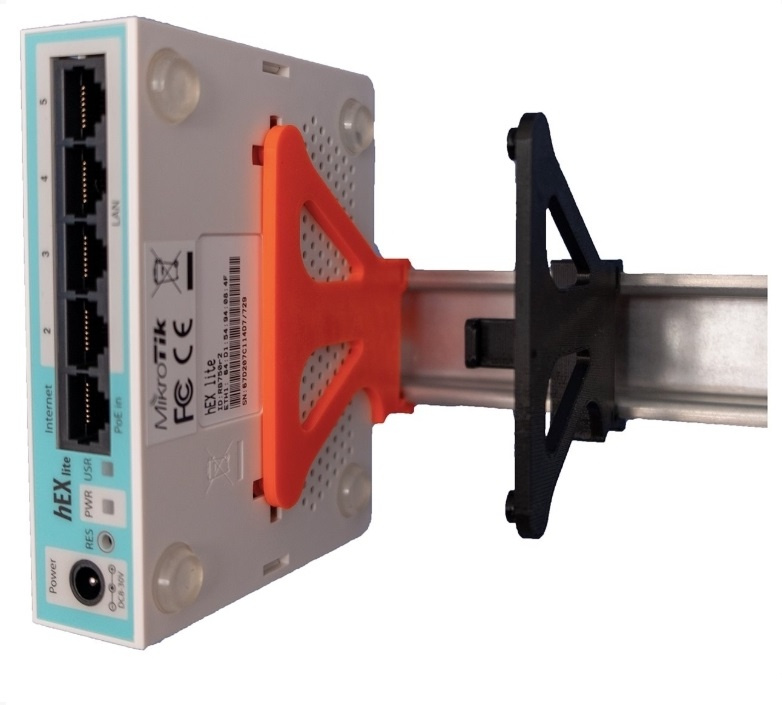 Plastový držák na DIN lištu umožňující vertikální uchycení Mikrotik aktivních prvků série hAP a hEX v racku.