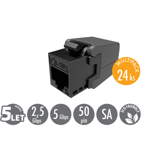 Kategorie: CAT5E Podporované protokoly: 2.5G/5GBASE-T a nižší Stínění: ne Min. životnost portu: 1 000 zapojení/odpojení Krytí kontaktů: 50 µ zlata a 100 µ niklu Svorkovnice: samozářezová Min. životnost svorkovnice: 200 zařezání Velikost a typ vodiče: AWG 26 - 22, drát Materiál nekovových částí: FR plast podle UL94-0 Barva: černá Skladovací teplota: -40 až 70 °C Provozní teplota: -10 až 60 °C Max. provozní vlhkost: 93 % Balení: 24 ks, kartónový box Rozměry balení (výška x šířka x hloubka): 60 mm x 148 mm x 120 mm Přepravní balení: 576 ks (tj. 24 balení po 24 ks), kartónový box Rozměry přepravního balení (výška x šířka x hloubka): 270 mm x 370 mm x 320 mm