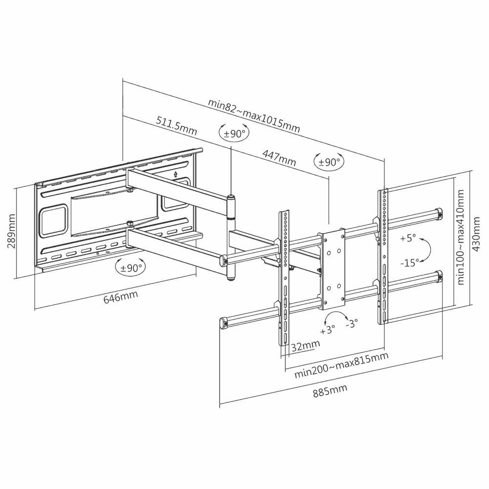 Najdlhší držiak televízie Fiber Mounts Big1 Nastaviteľná vzdialenosť od steny 82mm až 1015mm, otáčanie kolmo k stene Televízor s uhlopriečkou 43-80", naklápanie +5° až -15°, korekcia roviny +/- 3°, podporuje VESA štandardy 200x100 až 800x400, nosnosť 50kg Najdlhší držiak na otáčanie veľkých televízorov aj kolmo k stene. Vďaka nastaviteľnej vzdialenosti od steny 82mm až 1015mm umožňuje držiak Fiber Mounts Big1 otočenie o 90° na obidva smery aj televízorov s uhlopriečkou 43" až 80". Vysoká nosnosť 50kg zabezpečuje bezpečné zavesenie a polohovanie aj naozaj veľkých televízorov. Konštrukcia držiaka Big1 je oceľová, nástenný držiak o rozmeroch 646x289mm zabezpečí vynikajúce rozloženie celej hmotnosti na stenu. V balení nájdete montážny materiál. Záruka 3 roky. Najdlhší otočný držiak na Televízie Fiber Mounts Big1 Technické údaje: nosnosť 50kg pre televízory s roztečou VESA 200x100 až 800x400 zavesenie a otáčanie kolmo k stene Televízora 43" až 80" nastaviteľná vzdialenosť od steny 82mm až 1015mm možnosť naklápať televízor +5° až -15° korekcia roviny obrazovky +/- 3° inštalačný materiál súčasť balenia (viď nižšie) veľmi pevná a bezpečná konštrukcia zaistenie Televízora na držiaku proti vysadeniu materiál oceľ hmotnosť držiaka 13,5kg veľká inštalačná plocha pre rozloženie hmotnosti na stene 646 x 289mm farebné prevedenie čierne záruka 3 roky Fiber Mounts Big1 Vám otočí kolmo na stenu aj veľmi veľké televízie Držiak Fiber Mounts Big1 podporuje VESA štandardy: VESA 200x100 VESA 200x200 VESA 300x200 a 200x300 VESA 300x300 VESA 400x200 a 200x400 VESA 400x300 a 300x400 VESA 400x400 VESA 600x400 VESA 800x400 Najdlhší držiak na televízory Big1 má aj bezpečnostný systém na zabezpečenie televízie na držiaku Inštalačný materiál, ktorý nájdete v balení s držiakom Fiber Mounts Big1: hmoždinky o12x60 6ks vruty do hmoždiniek 8x90 mm 6ks podložky na vruty 6ks šrouby M5x14 4ks šrouby M6x14 4ks šrouby M6x30 4ks šrouby M8x30 4ks šrouby M8x50 4ks univerzálne podložky na šrouby 4ks distančná podložka 5mm 8ks distančná podložka 10mm 8ks V prípade, že dodávané šrouby nebudú vhodné na uchytenie televízora (ani pri použití podložiek alebo dĺžkových válečkov), je nutné zmerať potrebnú dĺžku a priemer šroubov a zakúpiť ich v obchode (napr. železiarstvo, v náradí a pod.). Fiber Mounts Big1 je najdlhší otočný držiak na veľké televízie Televízny držiak Fiber Mounts Big1 je ideálny na možnosť otáčania stredne veľkých a veľkých televízií (43" až 80") na obe strany (napr. z obývačky do kuchyne a pod.). Otáčanie je možné až o 90° na obe strany, teda kolmo k stene. Vynikajúca bezpečnosť a stabilita je zabezpečená silnostennou oceľovou konštrukciou (hmotnosť držiaka 13,5kg), o výborné rozloženie celkovej hmotnosti na stene sa postará veľká inštalačná plocha s rozmermi 646 x 289mm. Popis produktu bol preložený pomocou umelej inteligencie a môže obsahovať nepresnosti.