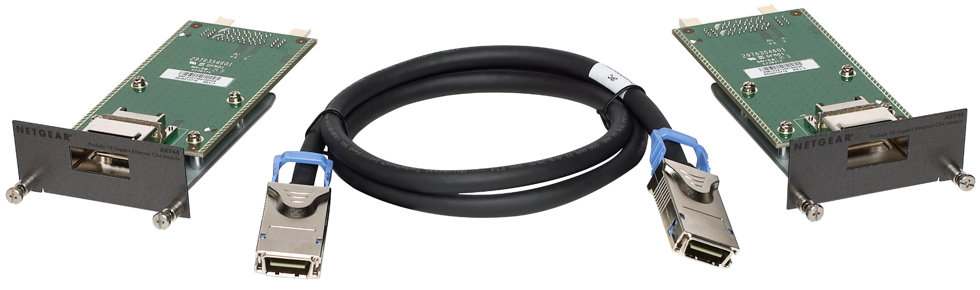 *For deployment convenience, M5300 series two rear I/O bays are pre-configured for stacking mode in factory default settings, allows for zero-touch stacking as soon as back connectivity is detected. *Copper, fiber can be mixed and matched for stacking interconnect. *One AX742 Stacking Kit per M5300 switch for local, dual ring topology *AX742 is a bundle: 2 CX4 I/O modules AX744 + 1 stacking CX4 cable (1m - 3.3 ft) *Latest IEEE 802.3ak 10GBASE-CX4 specifications (infiniband) *Each I/O module half-duplex speed is 12 Gbps (24 Gbps full duplex) with 1m cable *Dual ring stacking interconnect is 48 Gbps per switch (384 Gbps per stack) when one AX742 kit per switch (two I/O modules) *Longer cable may be used (standard infiniband CX4 cable) *Ordering Part Number (Worldwide): AX742