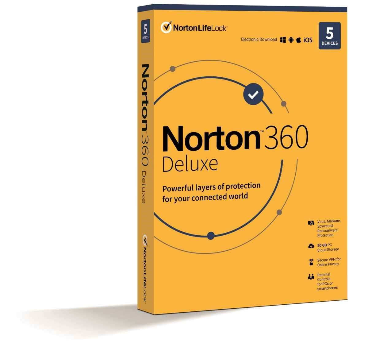 Elektronická licencia Norton 360 Deluxe poskytuje komplexnú ochranu proti škodlivému softvéru až pre 5 počítačov PC, Mac, zariadení so systémom Android alebo iOS, ako aj rodičovskú kontrolu, ktorá pomáha chrániť vaše deti online, správcu hesiel na ukladanie a správu hesiel a funkciu zálohovania z PC do cloudu. Norton 360 Deluxe obsahuje aj sieť VPN pre 5 zariadení a aplikáciu na ochranu fotoaparátu pre počítače. Určené pre nových používateľov a na obnovenie licencií existujúcich používateľov