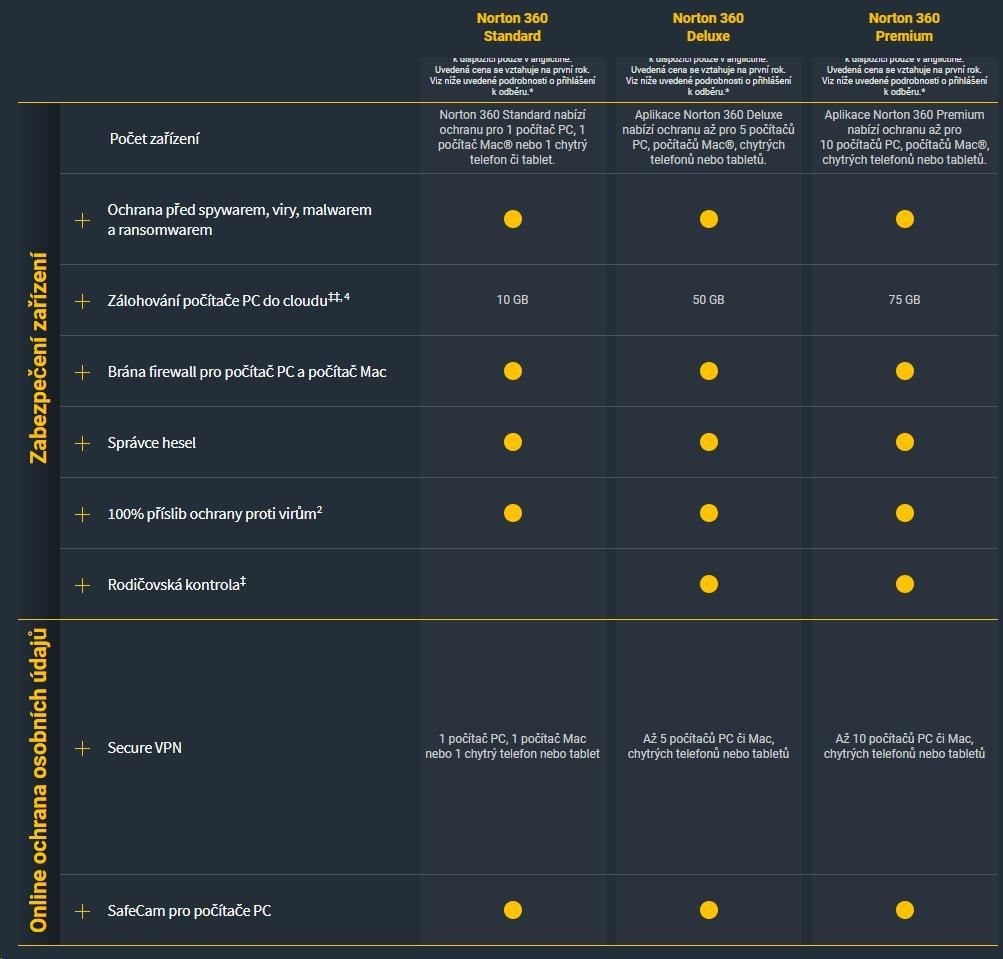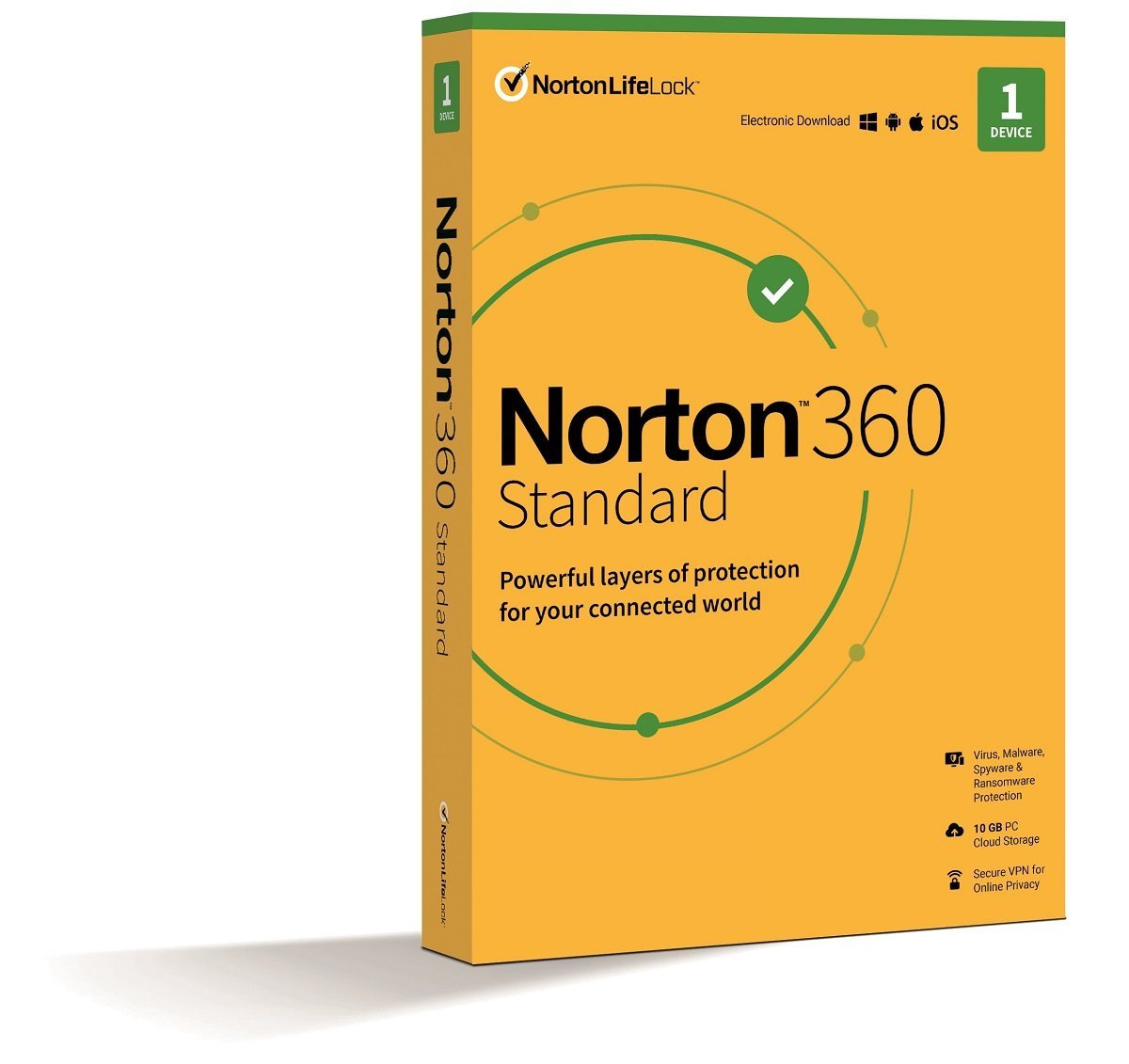 Norton 360 Standard poskytuje komplexnú ochranu proti škodlivému softvéru pre jeden počítač PC, Mac, zariadenie so systémom Android alebo iOS, ako aj funkciu cloudového zálohovania počítača, ktorá pomáha predchádzať strate údajov v dôsledku ransomvéru alebo poruchy pevného disku, a správcu hesiel na ukladanie a správu hesiel. Norton 360 Standard obsahuje aj ochranu VPN, ktorá umožňuje bezpečnejšie a anonymnejšie prehliadanie webu, a to aj vo verejných sieťach Wi-Fi, a aplikáciu na ochranu fotoaparátu pre počítače.