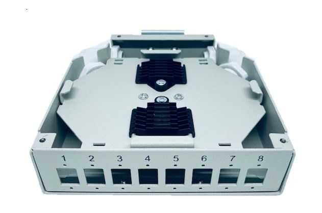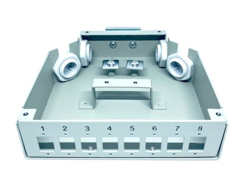 Popis produktu Optický rozvaděč/box pro umístnění na DIN lištu šedé barvy pro max. 8 SC simplex spojek, kovový se šroubovatelným víkem pro zakončení max. 12 optických vláken. Box má 4 kabelové vstupy a dodává se se 2 kabelovými průchodkami, držáky svárů neosazen spojkami.
