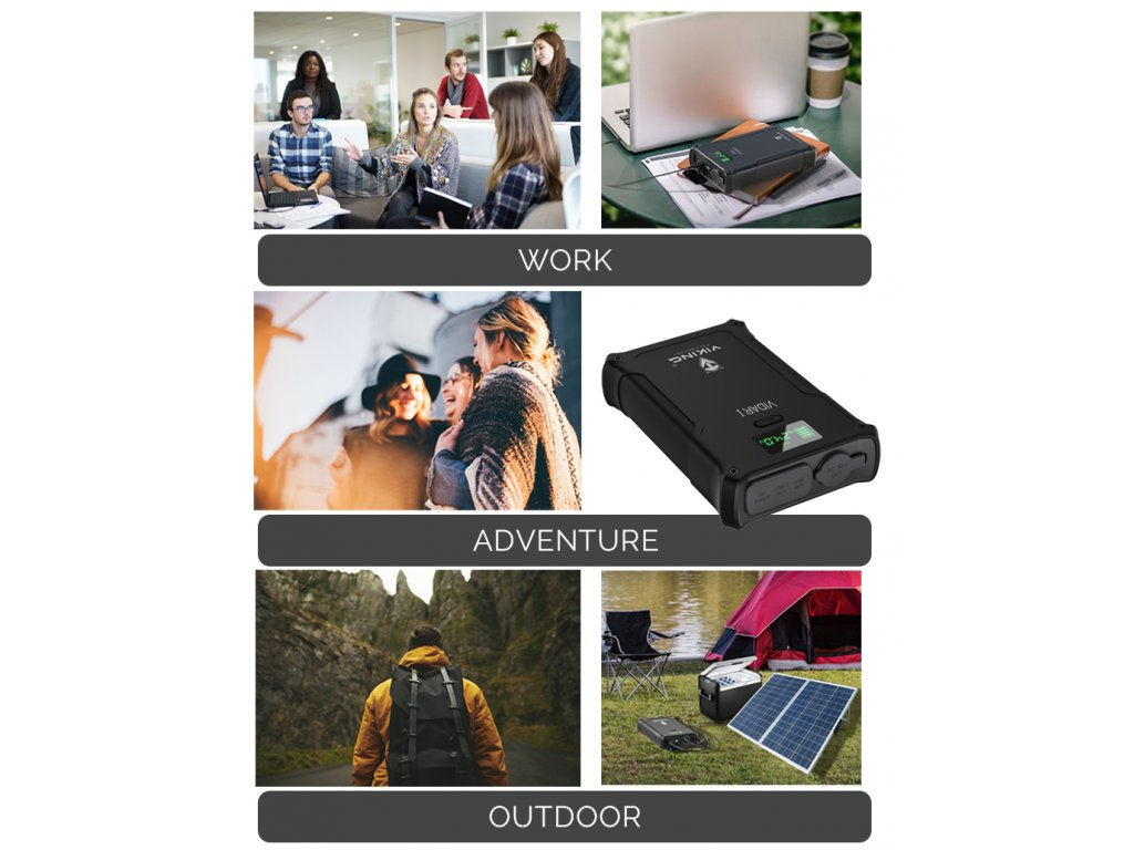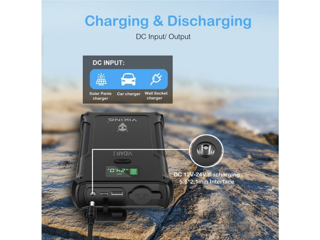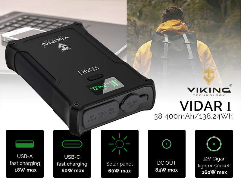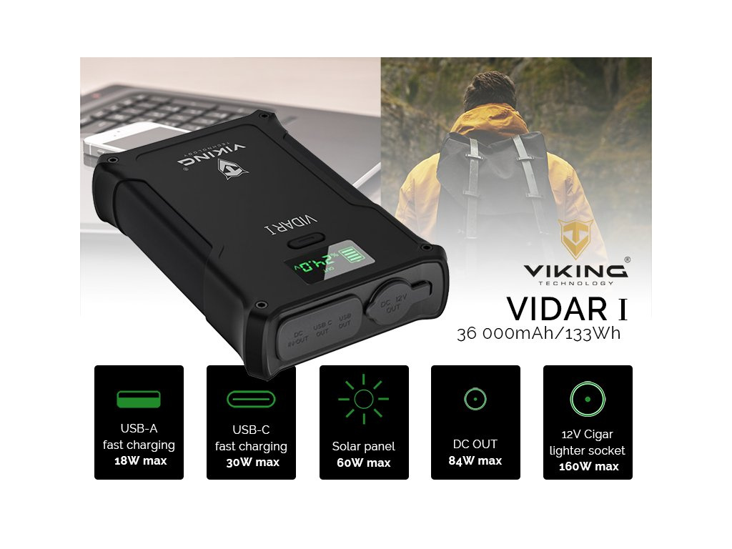 Outdoorová powerbanka Viking VIDAR I • Kapacita: 38400mAh/138Wh • Maximální výkon: 160W • Široká škála vstupů a výstupů (USB-A, USB-C, Cigaretová zásuvka, DC-jack) • Možnost solárního napájení • Funkce Pass-Through • Odolnost IP65