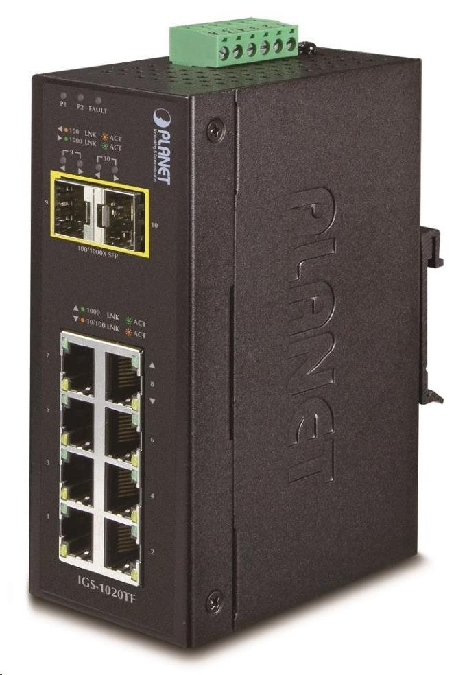 Priemyselný prepínač a konvertor 8x 10/100/1000Base-T, 2x SFP 100/1000Base-X. Energetická účinnosť podľa normy 802.3az.