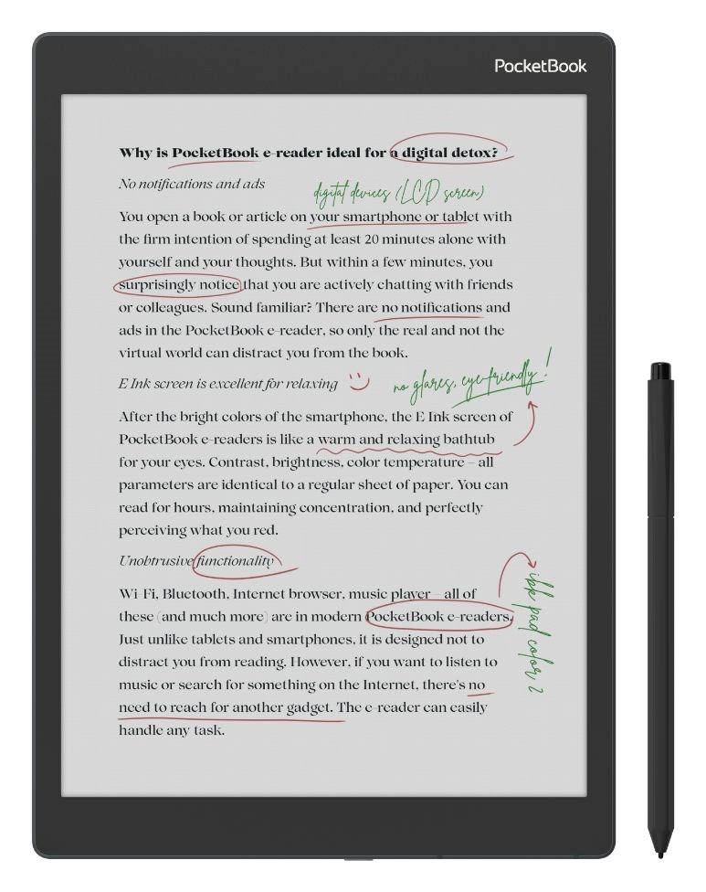 Veľký 10,3” farebný displej E Ink Kaleido™ 3, založený na technológii Mobius™, je maximálne šetrný k očiam. Neoslňuje a poskytuje dostatok priestoru pre pohodlné písanie a čítanie.