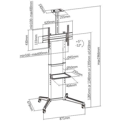 • Montáží deska pro upevnění TV je nastavitelná ve čtyřech výškových úrovních – 1285, 1340, 1395 nebo 1450 mm