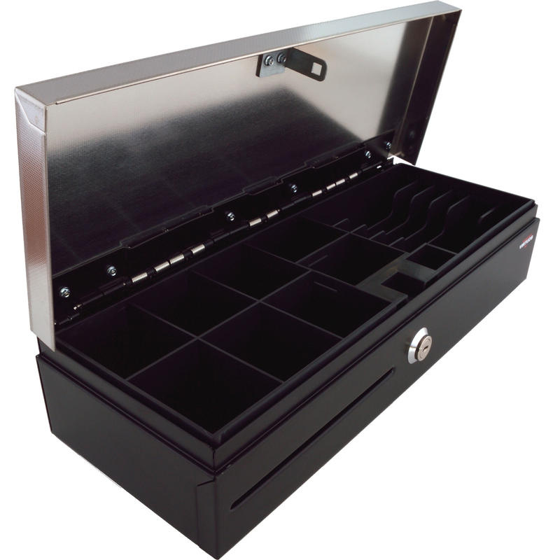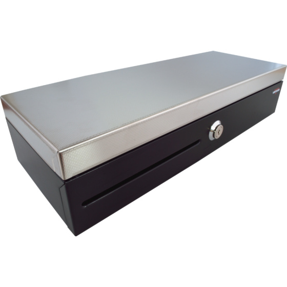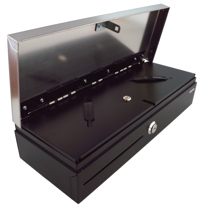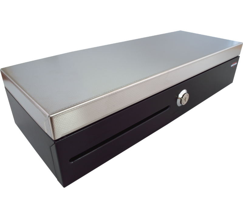 Pokladničná zásuvka flip-top FT-460C2 - s káblom, so zamyk. krytom zakladača, Nerez veko, 9-24V, čierna