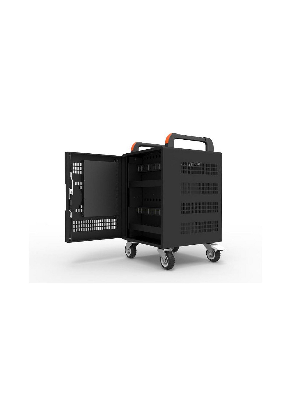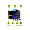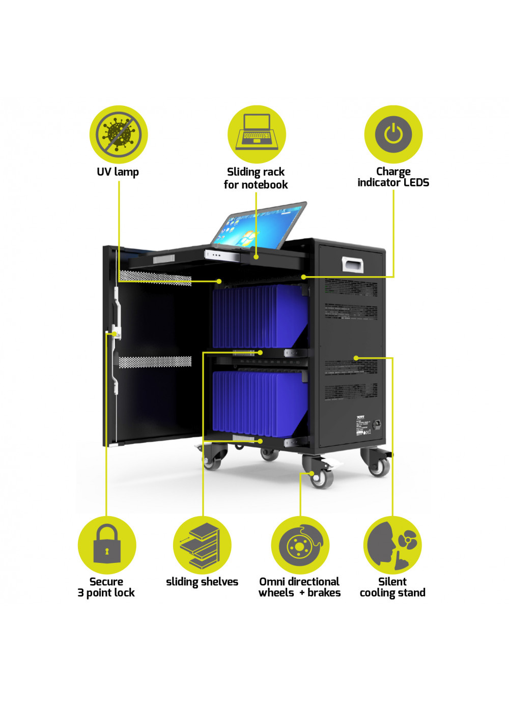 Kapacita: až 20 tabletů a 1 notebook Uzamykatelné dveře - 3 bodový zámek Ochrana proti přepětí Inteligentní nabíjení 2,1A Indikátor stavu nabíjení Tichý ventilátor chlazení Integrovaná UV lampa: ničí viry a bakterie Posuvné police pro snadný přístup Kolečka pro transport + brzdy