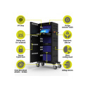 Nejefektivnější řešení pro bezpečné nabíjení až 40 tabletů a 1 notebooku Originální napájecí skřínka s funkcí dobíjení, kolečky pro transport a bezpečnostním zámkem Kapacita: až 40 tabletů a 1 notebook Uzamykatelné dveře - 3 bodový zámek Ochrana proti přepětí Inteligentní nabíjení 2,1A Indikátor stavu nabíjení Tichý ventilátor chlazení Integrovaná UV lampa: ničí viry a bakterie Posuvné police pro snadný přístup Kolečka pro transport + brzdy Rukojeť SPECIFIKACE Kapacita: až 40 tabletů + 1 NB Vstup: 220-240V AC 50 / 60Hz -8A Výstup: DC 5V / 2.4A na port / 220 V - 240 V ~ 50/60 Hz, max. 120 W Barva: Černá Kompatibilita: Tablety, elektronická zařízení a 1x NB do velikosti 17’’ Maximální velikost tabletu(zařízení): 22 x 2,5 x 30,8 cm Maximální velikost NB(zařízení): 33 x 4,2 x 44,5 cm Hmotnost: 67,6 kg Rozměry a hmotnost balení: 81 x 56 x 155,5 cm/ 103,4 kg OBSAH Skřín Napájecí kabel AC