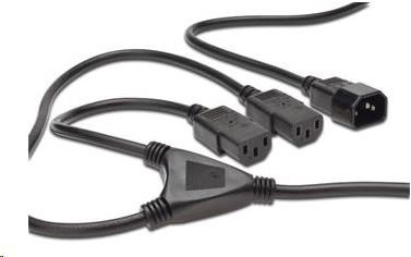 Napájací kábel PremiumCord 230V, predlžovací Y-kábel M-2x F Predlžovací napájací kábel k monitoru alebo počítaču alebo na pripojenie napájania monitora k počítaču - slúži aj ako rozbočovač pre 230V kábel. Štandardná prístrojová zásuvka, trojvodičová. Parametre a špecifikácie: Prierez všetkých vodičov: 3x0,75 mm2 Prúdové zaťaženie kábla so zástrčkou: max. 10 A Súčet prúdov dvoch káblov so zásuvkou: max. 10 A Napätie max.: 250V Farba: čierna Dĺžka kábla so zástrčkou (samec) k rozdvojke: 120 cm Dĺžka kábla od rozdvojky k 1. zásuvka (samica) : 50 cm Dĺžka kábla od rozdvojky po 2. zásuvka (žena): 30 cm..