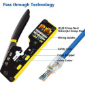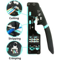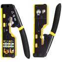 PremiumCord krimpovacie kliešte na priechodné RJ konektory sú spoľahlivým univerzálnym nástrojom na prácu s väčšinou bežných modulárnych zástrčiek radu RJ — vrátane RJ11, RJ12, RJ14, RJ45 a ďalších typov. Vďaka konštrukcii 3 v 1 umožňujú jednoduché krimpovanie, strihanie aj odizolovanie káblov, čo výrazne urýchľuje a upresňuje prácu pri výrobe či opravách sieťových a telefónnych vedení.