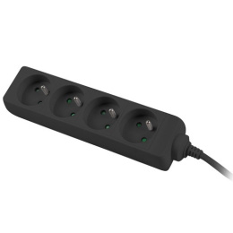 Praktický prodlužovací kabel se 4 zásuvkami, černá barva*Počet zásuvek: 4*Vypínač: ne*Maximální napě