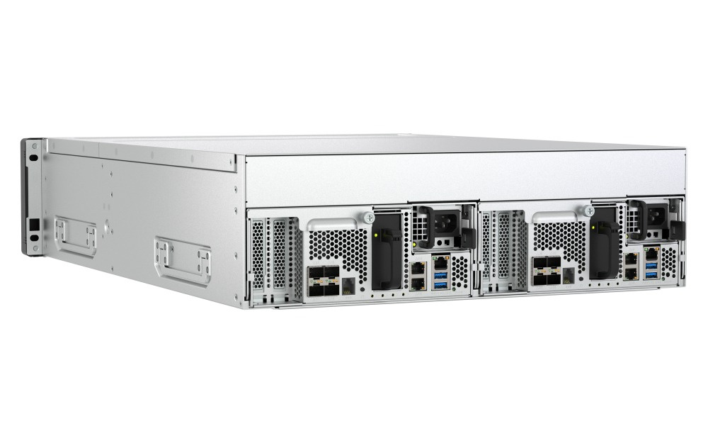 ES1686dc-R2-2123IT-64G podnikový NAS s vysokou dostupností (HA) a dvěma aktivními řadičiOdkaz na web výrobce: https://www.qnap.com/cs-cz/product/es1686dc%20r2 Seznam kompatibility pro tento model: https://www.qnap.com/cs-cz/compatibility/?model=798&category=1&filter[type]=1 Funkce Zajistěte si nepřetržitý provoz kritických podnikových operací využitím zařízení NAS ES1686dc R2 s vysokou dostupností. Redundantní řadiče a napájecí zdroje minimalizují prostoje a umožňují plynulou výměnu komponent bez přerušení, což zajišťuje spolehlivost a kontinuitu provozu. * Podporuje téměř neomezený počet snímků ZFS, SnapSync, blokovou deduplikaci a inline kompresi dat. * Čtyři porty 10GbE SFP+ na každý řadič zrychlují virtualizaci, sdílení velkých souborů a vysokorychlstní přenos dat. * Paměť NVRAM snižuje riziko ztráty dat mezipaměti (cache) pro zápis v případě neočekávaného výpadku napájení. * Podporuje VMware® vSphere®, Windows Server® a Citrix® XenServer®. OBSAH BALENÍ * 1x ES1686dc R2 * 2x ethernetový kabel (1GbE) * 2x napájecí kabel * 64x šroub s plochou hlavou (pro 3,5" HDD) * 64x šroub s plochou hlavou (pro 2,5" HDD) * RAIL-E02: sada lišt řady E02 (šasi), max. nosnost 57 kg * 1x konzolový kabel (RJ11 na RS-232) * 2x záložní baterie pro NVRAM * 1x průvodce instalací (QIG) SPECIFIKACECPU * čtyřjádrový procesor Intel® Xeon® D-2123IT 2,20 GHz (navýšení až na 3,0 GHz) na jeden řadič Architektura CPU * x86 64 bitů Jednotka s pohyblivou řádovou čárkou * ano Šifrovací modul * ano (AES-NI) Systémová paměť * 32GB RDIMM DDR4 ECC (4x 8GB) na jeden řadič Maximální paměť * 512GB (8x 64GB) Paměťový slot * 8x R-DIMM/LR-DIMM DDR4 Paměť Flash * 4GB (dvojitá ochrana OS při spouštění) Pozice pro diskové jednotky * 16x 3,5" Kompatibilita diskových jednotek * 3,5" SAS jednotky pevných disků * 2,5" SAS jednotky pevných disků * 2,5" SAS SSD Vyměnitelné za provozu * ano Cache pro kopírování do paměti Flash (C2F) 1x na každý řadič (64GB M.2 SSD) Podpora akcelerace mezipaměti SSD * ano (pouze pro čtení) Gigabitový Ethernet port (RJ45) * 3x pro každý ovladač (přiřaďte jeden pro vzdálenou správu) 10 gigabitový Ethernet port * 4x 10GbE SFP+ pro každý řadič Probuzení po síti LAN (WOL) * ano Rámec Jumbo * ano Slot PCIe * slot 1: PCIe Gen 3 x8 (CPU) * slot 2: PCIe Gen 3 x8 (CPU) Port USB 3.2 Gen 1 * 2x na každý řadič Form Factor * 3U s montáží do racku Tlačítka * napájení * reset Rozměry (VxŠxH) * 132x446,2x587,75mm Hmotnost (čistá) * 30,22kg Hmotnost (celková) * 34,92kg Provozní teplota * 0-40°C Napájecí jednotka * redundantní/rychlovýměnný napájecí zdroj 90–264 V AC; 700W Ventilátor * modul ventilátoru vyměnitelný za provozu (3x 60x60x38mm; 16000 ot./min/12 V/2,8 A) Spotřeba energie * 500,87W Max. počet souběžných připojení (CIFS) – s max. pamětí * 10000 Více informací se dozvíte na stránkách výrobce.