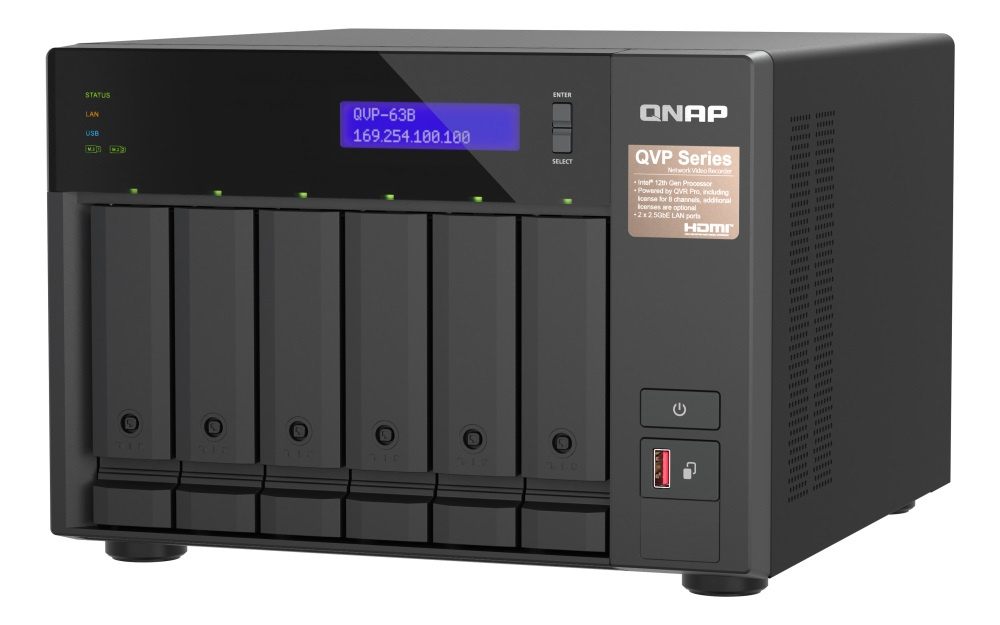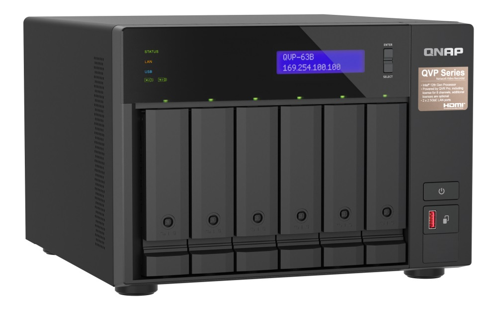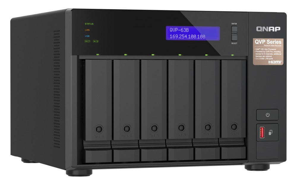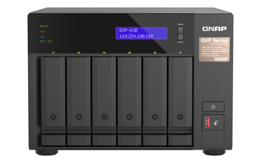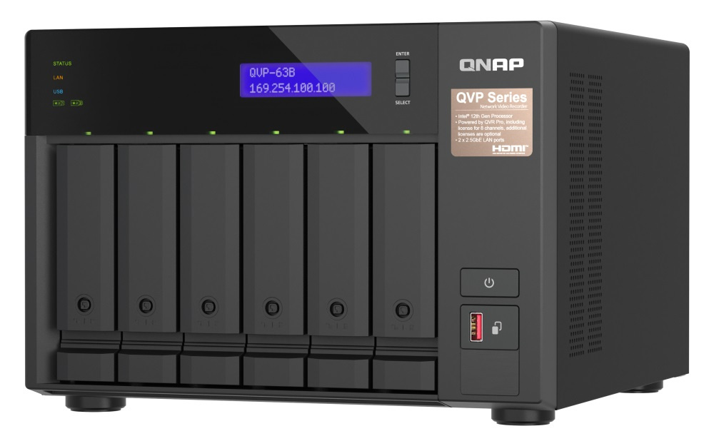 Popis QNAP NVR QVP-63B (4core 4,3GHz, 16GB RAM, 6xSATA, 2xGbE, 2xM.2 NVMe Gen4, 2xPCIe, kamery: 8 (max 36)