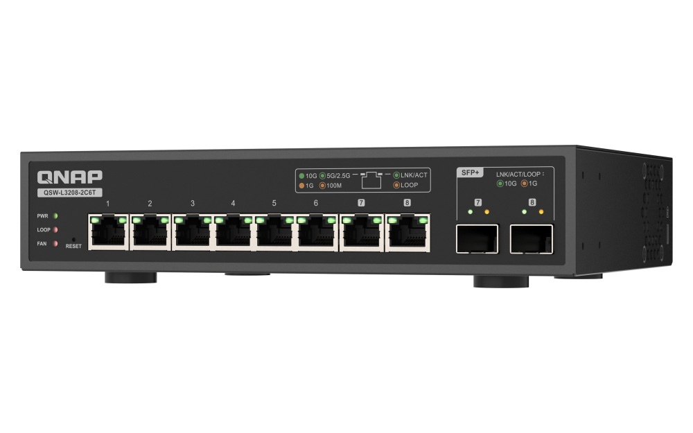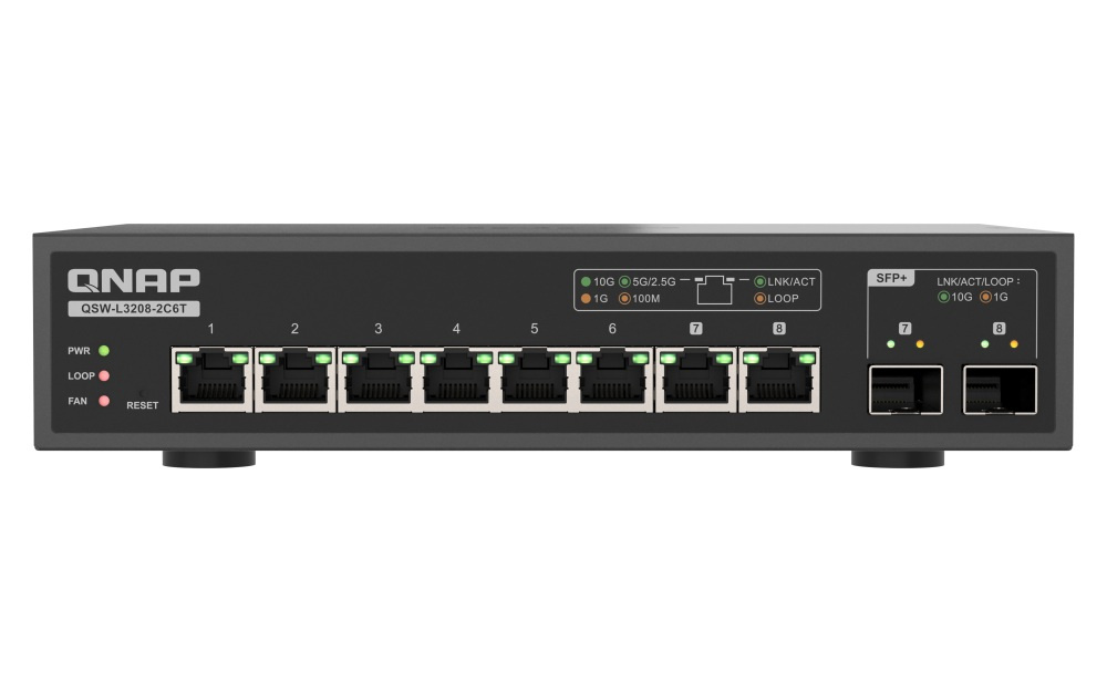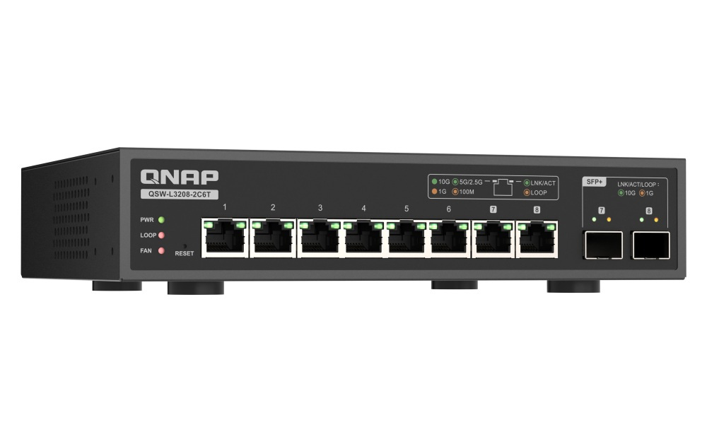 Popis QNAP switch QSW-L3208-2C6T (6x 10GbE port, 2x 10G SFP+/NBASE-T Combo, Lite Managed)
