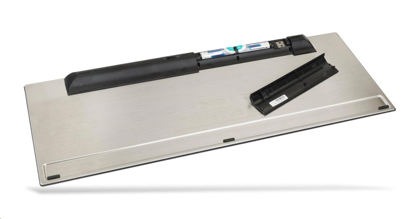 • Obsah balenia: Viacrežimová bezdrôtová klávesnica, nano prijímač USB, 2 alkalické batérie (AA) (sú súčasťou balenia), stručná príručka