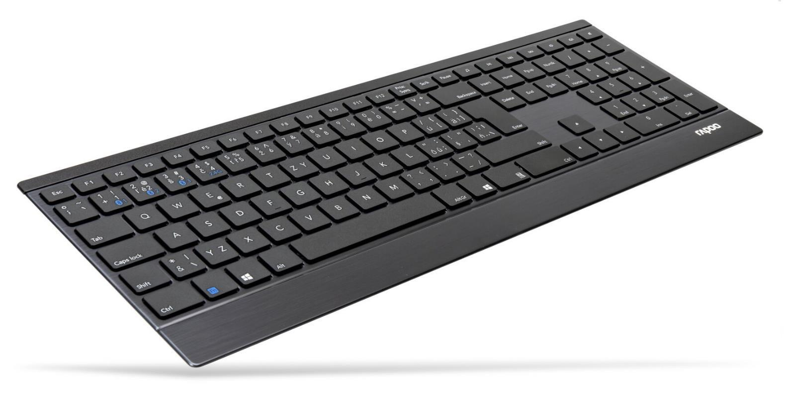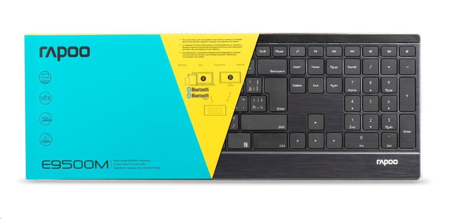 Táto ultratenká klávesnica kombinuje prémiové materiály so štýlovým dizajnom. Telo klávesnice vyrobené z nehrdzavejúcej ocele a zliatiny hliníka je nielen pevné a odolné, ale dodáva stolu aj určitý štýl. Klávesnica E9500M nie je pokročilá len dizajnom, ale aj funkčnosťou. Ponúka technológiu viacrežimového pripojenia Rapoo - prostredníctvom spoľahlivého 2,4 GHz bezdrôtového vysielača, Bluetooth 3.0 a 4.1 - umožňuje súčasné pripojenie a prepínanie viacerých zariadení (s automatickým párovaním). Okrem toho technológia úspory energie od spoločnosti Rapoo zaručuje životnosť batérie až 12 mesiacov, čím sa minimalizuje potreba jej výmeny.