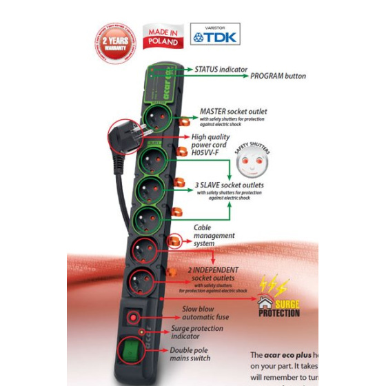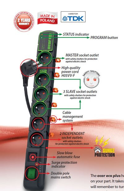 Jednoduchý popis - v obývacím pokoji máte televizi, set-top box, domácí kino a satelit. Napáječ funguje tím způsobem, že pouští energii pouze do TV, zbytek zařízení má napájení vypnuto, ve chvíli, kdy zapnete TV, napáječ automaticky pustí energii i do zbývajících zařízení. Tím ušetříte za energii v tzv. pohotovostním režimu.