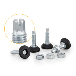 Sada nivelačních nožiček pro stojanové rozvaděče s možností nastavení z vnitřní strany rozvaděče. Po rektifikaci je nutné zajistit polohu maticí.