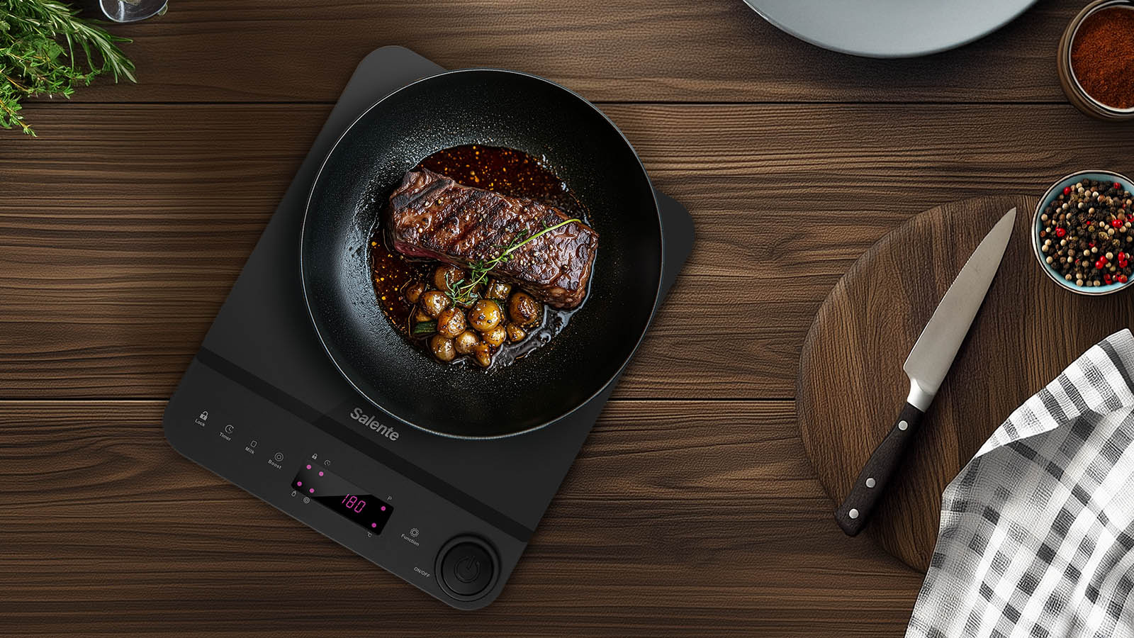 Každý pokrm vyžaduje jinou péči – někdy potřebujete jen jemné zahřívání, jindy pořádný žár. Salente InductPro1 vám proto nabízí 10 úrovní teploty (v rozsahu 60 až 240 °C) a 10 úrovní výkonu (až do 1800 W). A pokud zrovna spěcháte, můžete se spolehnout na funkci Boost, která na 30 sekund zapne maximální výkon.