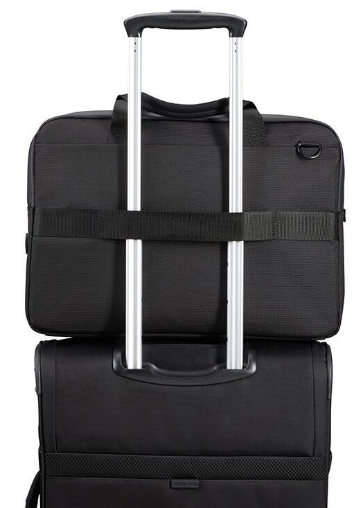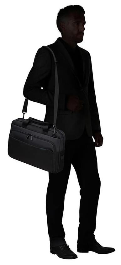 prostor na notebook 39,6 cm / 15,6" prostor na tablet 26,7 / 10,5" kapsa na zip z přední strany organizér smart sleeve - návlekový pásek sloužící ke snadnému připevnění na rukojeť kufru odnímatelný ramenní popruh rozměr 42 x 30 x 10,5 váha: 0,7 kg objem: 12,5 l Záruka 2 roky.