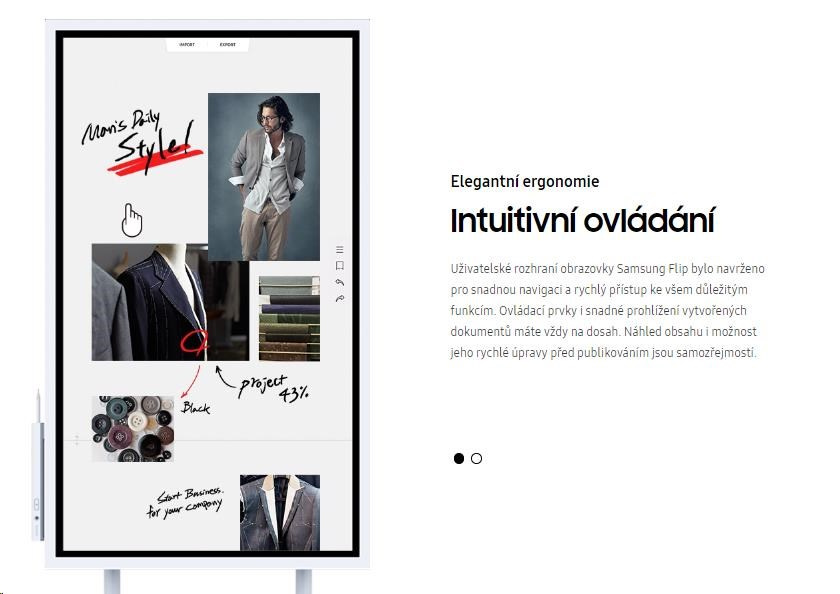 Elegantný svetlo šedý vzhľad Samsung Flip z neho robí dokonalý doplnok každého moderného pracoviska. Vyniká ergonomickým dizajnom s možnosťou naklonenia o 4,5 stupňa. Taktiež je vybavený puzdrom na pero a odkládateľnou poličkou. Flip je jednoducho pripravený poskytnúť vám moderný spôsob pôsobivej prezentácie myšlienok aj praktické pomôcky pre každodennú prácu.