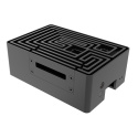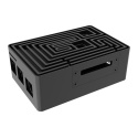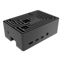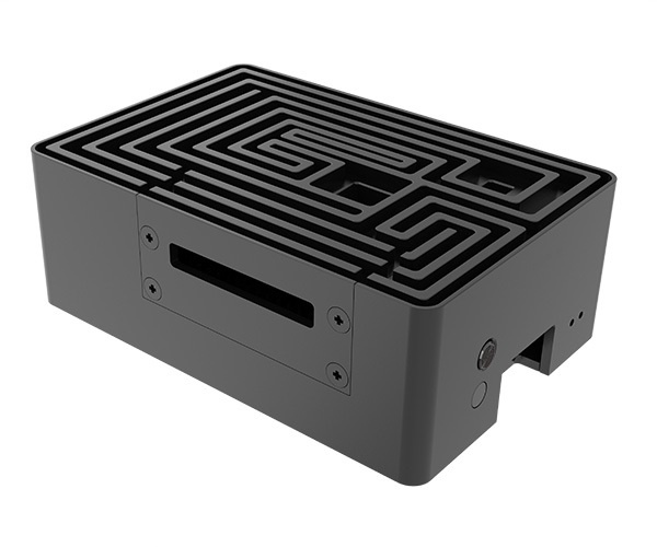 Černá eloxovaná skříň s nápadným designem bludiště nahoře. Vestavěné duální hliníkové jádro tiše chladí Raspberry Pi 4. Je vybavena přeprogramovatelným tlačítkem napájení a plnou podporou I/O.