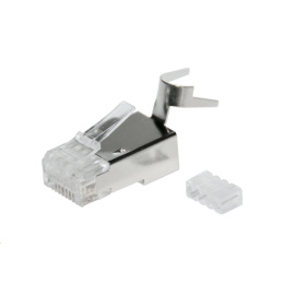 Tyto stíněné konektory Solarix RJ45 8p8c s vložkou jsou určeny pro kabely drát kategorie 6A a kategorie 7. Konektory jsou speciálně uzpůsobeny tak, aby jej bylo možné pohodlně nakrimpovat na kabely se silnějšími vodiči (až do průměru 0,57 mm) a silnější PE izolací (až do průměru 1,50 mm). Maximální tloušťka kabelu může být až 8,00 mm. Kontakty těchto konektorů Solarix kategorie 6A jsou kryty 50 µ zlata. Ke krimpování těchto kontektorů prosím použijte kleště HT-N3. Ke konektorům lze pak dokoupit ochrany v šedé barvě RAL 7035. Tyto konektory Solarix bez problémů splňují všechny požadavky definované v mezinárodních standardech ANSI/TIA 568, ISO/IEC 11801 a EN 50173 pro kategorii 6A a třídu vedení Class EA, včetně všech nejnovějších dodatků.