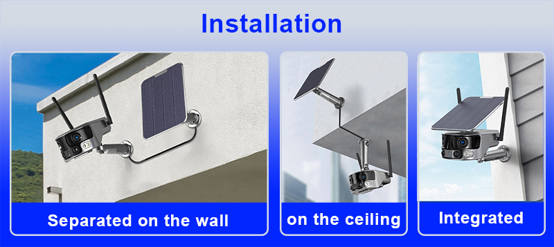 solární napájení · rozlišení 4K (4096*2160) · ultraširoký záběr 180°· složený obraz dvou objektivů · ochrana IP66 · PIR čidlo · detekce lidského pohybu · noční infračervené a barevné vidění na vzdálenost 20 - 40 m · WIFI připojení · ovládání v chytré aplikaci · obousměrný interkom · možnost ukládání na cloud uložiště nebo na TF kartu