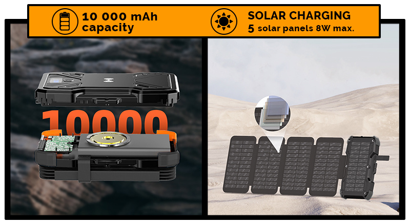 Solární powerbanka • Kapacita 10000mAh (37Wh) • podpora rychlonabíjení QC3.0 a Power Delivery • USB-C vstup až PD18W • USB-C výstup (PD20W max.) • 2 x USB-A výstup (QC22.5W max.) bezdrátové wireless nabíjení 15W max. • 5 solárních panelů 8W max • IP54 • LED svítilna