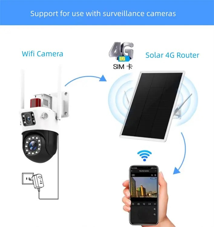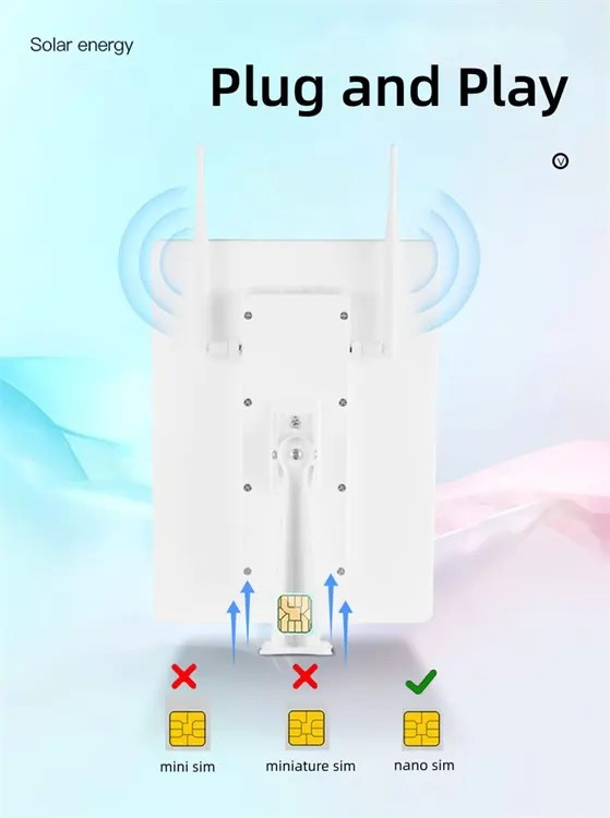 4G připojení · WiFi 2.4GHz · solární napájení 15W · WiFi až pro 8 zařízení · rychlost stahování až 150 Mbps · podpora LTE/WCDMA pásma · výdrž baterie až 50 hodin · odolnost proti teplotám -15°C až 75°C · bezpečnostní režimy WPA-PSK, WPA2-PSK · dosah WiFi až 60 metrů · mobilní připojení a správa přes aplikaci · SIM nano karta · rozměry 28,3 x 17 x 5 cm