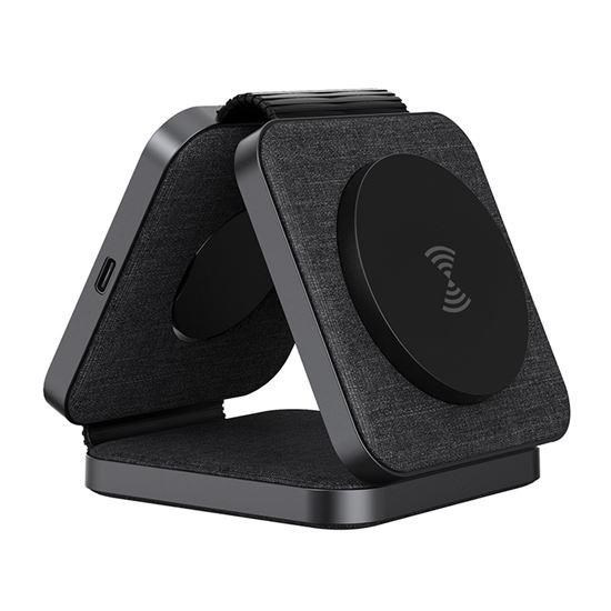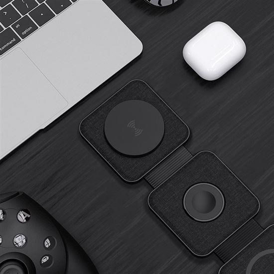 • hlavná nabíjacia plocha pre telefón (až 15 W), výklopná nabíjacia plocha pre Apple Watch (3 W) a sekundárna nabíjacia plocha pre slúchadlá/další telefón (5 W)