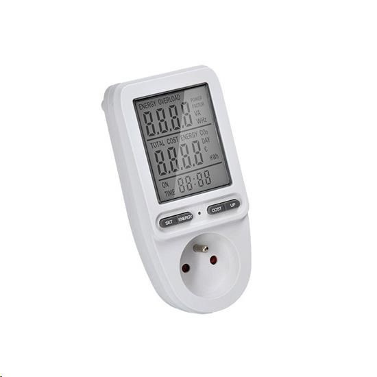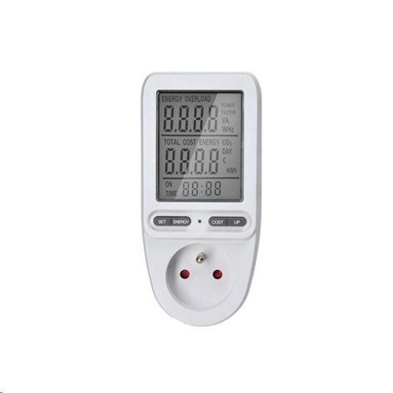 veľký a prehľadný LCD displej, uhlopriečka 3" - 7,5cm max. nameraná doba: 9999 dní max. nameraný odber: 9999kWh min. množstvo zaznamenávaného príkonu: 2W, max.: 3680W/16A celková doba odberu nastavenie ceny za energiu 4 tlačidlá pre jednoduchú obsluhu presný výpočet ceny a meranie spotrebovanej energie detská poistka indikácia prekročenia max. príkonu meranie elektrických veličín: prúd, napätie, frekvencia, okamžitý odoberaný výkon integrovaný stabilizátor napätia až do +- 1,5% odchýlky od menovitého napätia pre presné meranie pracovná teplota: 0 až + 50°C napájanie: AC 230V, 50Hz zabudovaná záložná batéria pre uchovanie nameraných hodnôt