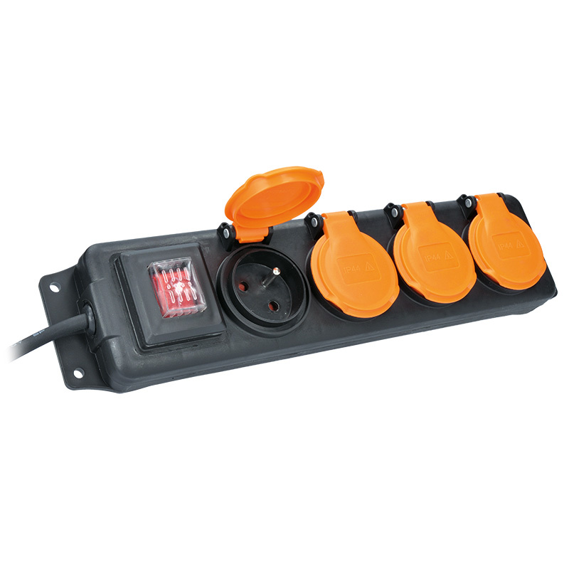 Popis Solight prodlužovací přívod IP44, 4 zásuvky, gumový kabel, vypínač, venkovní, 10m